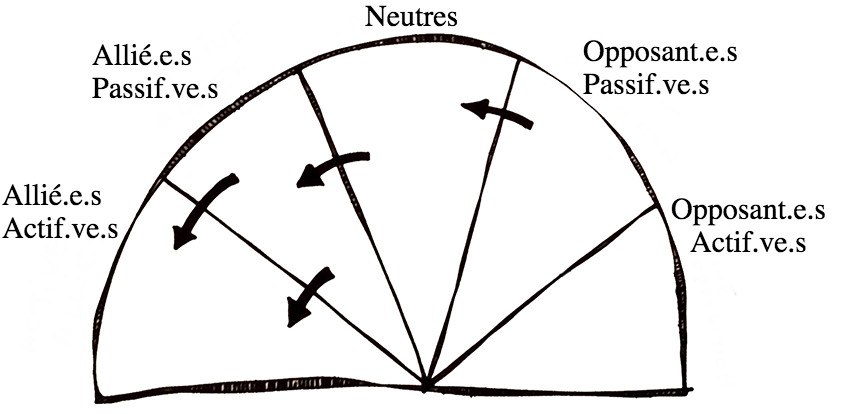 Le « baromètres des allié·es » est une autre manière de comprendre où se situent nos interlocuteur·ices vis-à-vis de la cause que nous défendons. Ici, il s'agit de comprendre qu'il est difficile de convaincre les opposant·es actif·ves de se rallier à notre cause, mais plutôt d'arriver à déplacer les gens d'une tranche du spectre vers la gauche.