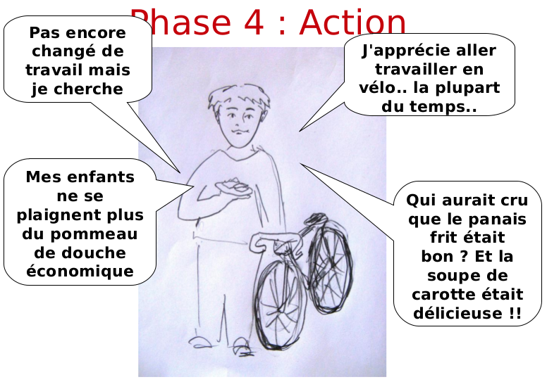 - entreprend de petites actions, qui permettent de vérifier que le bénéfice est au rendez-vous (satisfaction, plaisir, sentiment de contribuer, influence sur le portemonnaie, sur l'organisation, etc.).