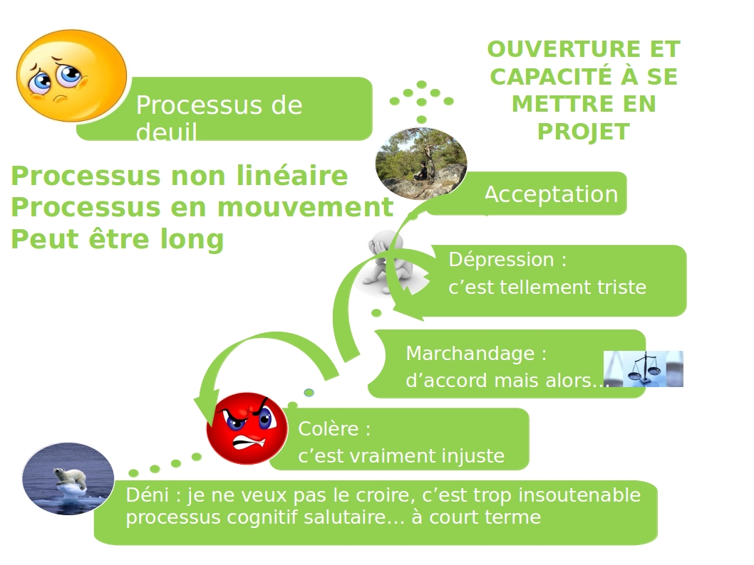 Un bon modèle pour comprendre ceci est celui du deuil. Nous traversons tous ces phases, sur des sujets différents, à des vitesses et profondeurs différentes, de façon non linéaire. Le choc initial enclenchant un processus de deuil est une perte. Perte d'un être aimé, perte d'une relation, perte d'un travail... perte de repères... perte des idées fortes, des plans que nous nous faisions pour le futur proche ou lointain. Enfants à l'université, pension, monde en paix... Ces temps non ordinaires que vivent l'humanité sont sources de choc, individuellement mais aussi collectivement. Ils touchent autant nos rêves personnels que les imaginaires collectifs. Il est important de savoir accueillir ce qui résulte de ces chocs, de tenter de ne pas être en réaction contre les réactions, sur la défensive face aux défenses.... pour éviter de faire "plus de la même chose", de rentrer dans une escalade qui finit par nier les émotions intenses que peut ressentir chaque personne face à la réalité de ce qui nous arrive. La motivation, ce qui meut, ce qui émeut... nos émotions peuvent (doivent ?) être accueillies, circuler et devenir source d'actions. Des pratiques simples, comme laisser des pairs de personnes dialoguer sur leurs émotions face à l'état du monde, créent des liens forts et puissants, favorisent une solidarité tissant la toile de la résilience.