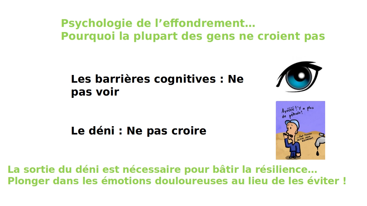 Notre cerveau n'est pas vert. Il a des difficultés à appréhender les réalités des crises que nous vivons. Il se représente difficilement ce qui est loin, dans l'espace ou dans le temps, ce qui nécessite une trop grande abstraction. Par ailleurs, prendre la mesure de la réalité de ce que notre espèce est en train de faire et de vivre est d'une telle ampleur que nous mettons en place une série de mécanismes de défense très utiles pour ne pas devoir y faire face. La première de ces barrières est le déni. La Transition intérieure s'intéresse à ces mécanismes, à travers notamment la psychologie du changement, pour chercher ce qui peut nous aider à appréhender cette réalité, à l'accepter puis à la transmettre.