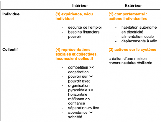 ensuite, si je ne prends en compte que les dimensions extérieures de la transition, j'élude tout le travail sur les normes sociales dominantes, les visions du monde, les représentations et les imaginaires collectifs dont je suis imprégnée plus ou moins consciemment. Par exemple : même si la colocation que j'ai créée se veut « en transition », elle fonctionne comme dans le monde dont je ne veux plus. Il y règne la compétition plutôt que la coopération, un fonctionnement pyramidal plutôt qu'un partage sain du pouvoir, etc. Je suis dans le quadrant collectif intérieur (4).